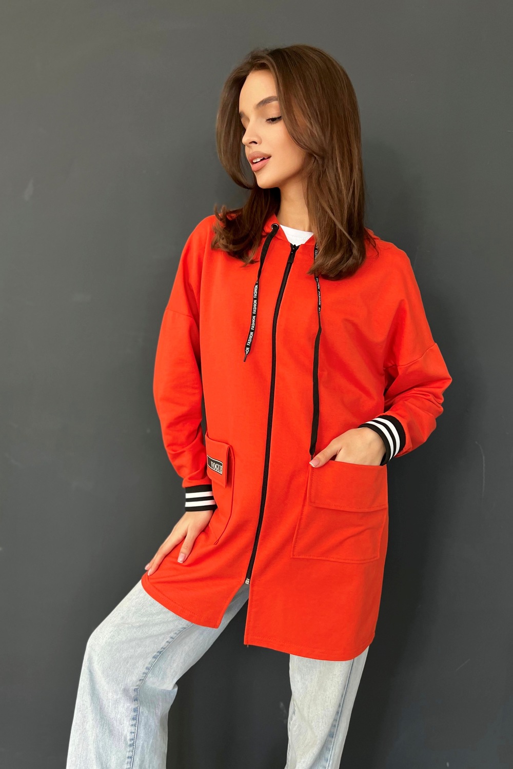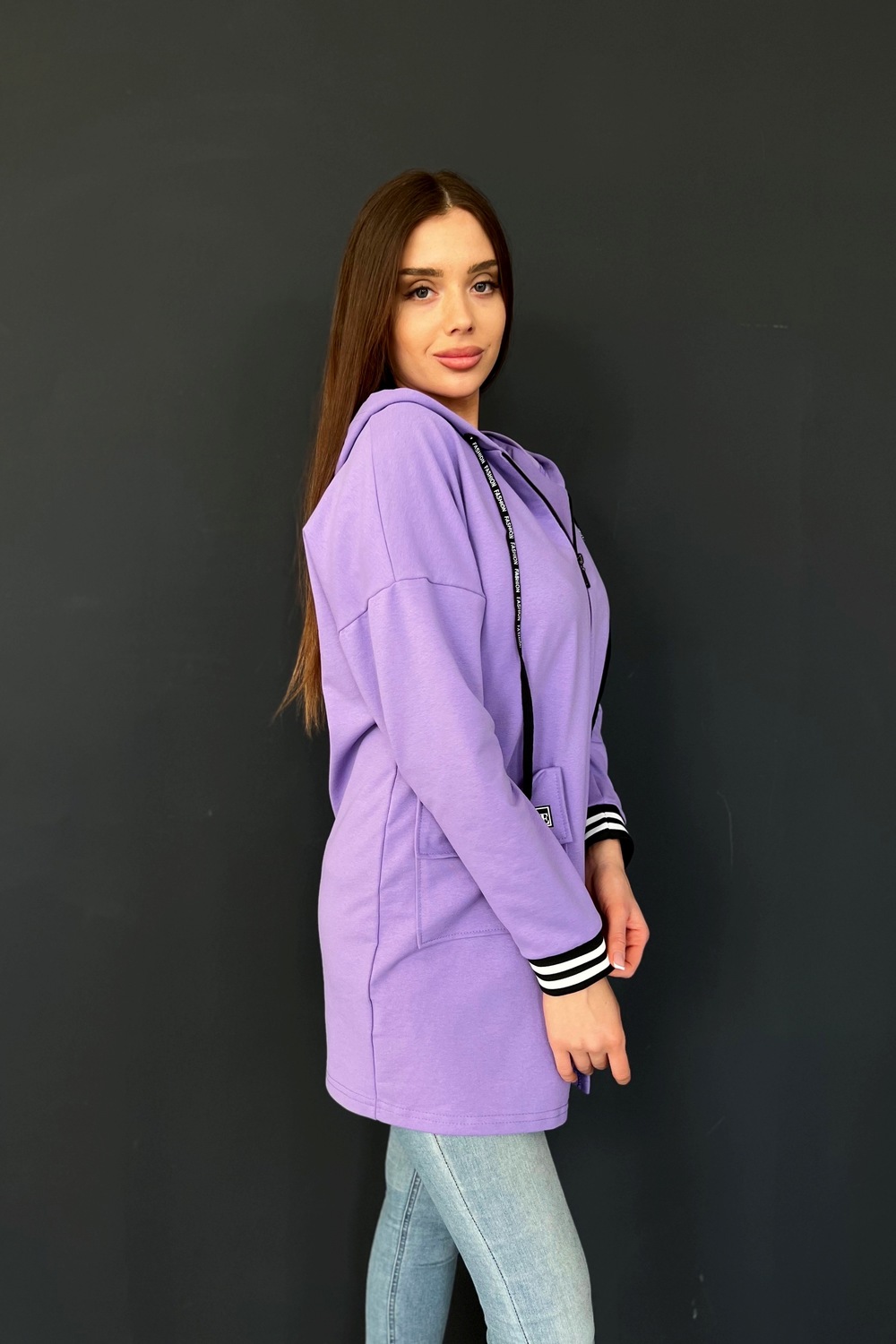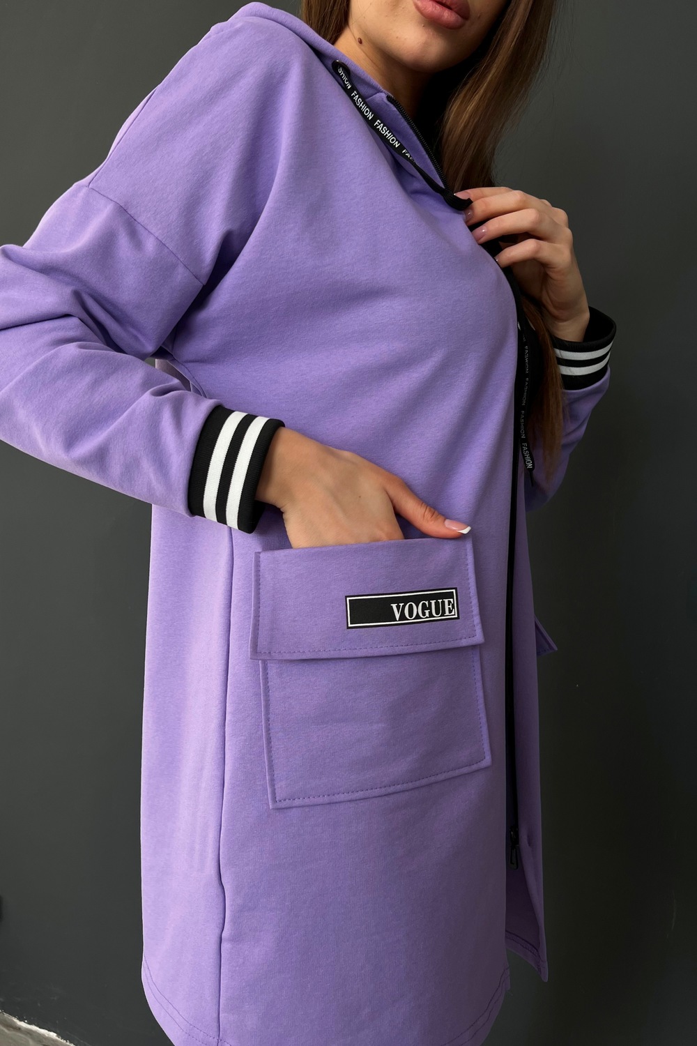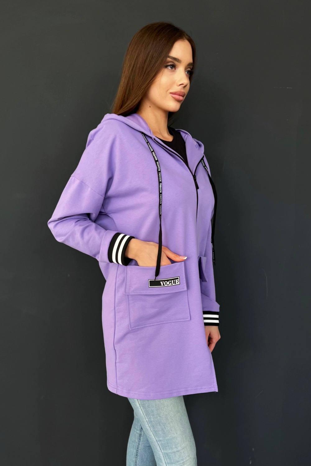 Толстовка прямая, свободная, удлиненная, с капюшоном, на молнии. Рукав длинный, на эластичном манжете. На полочке обработаны накладные карманы с клапаном.