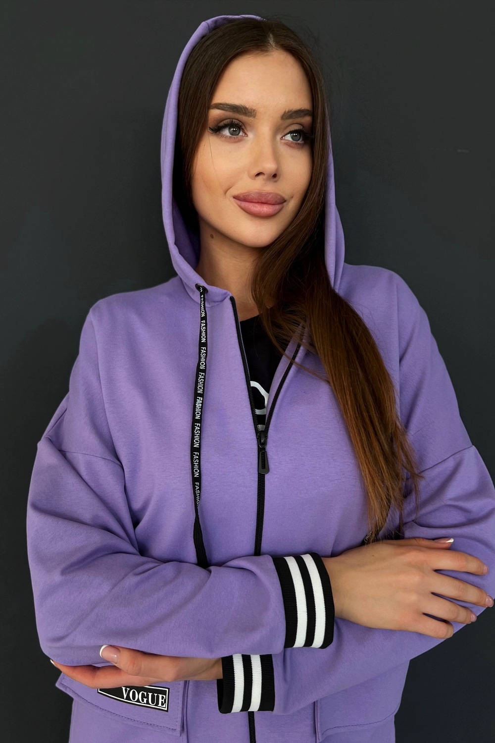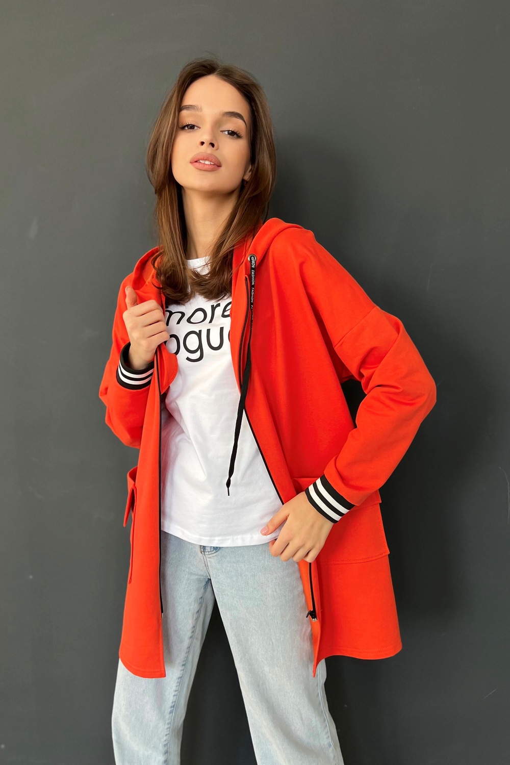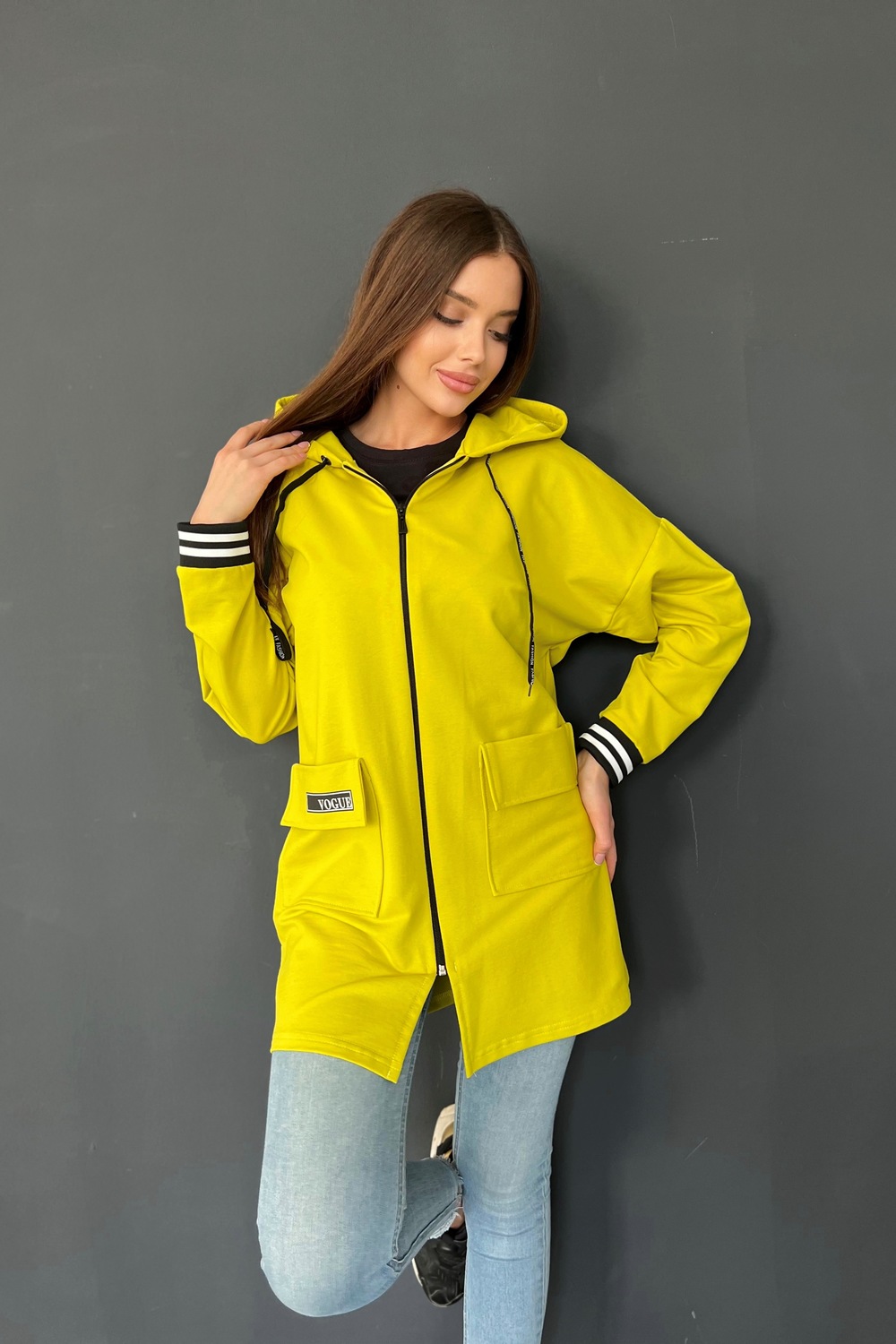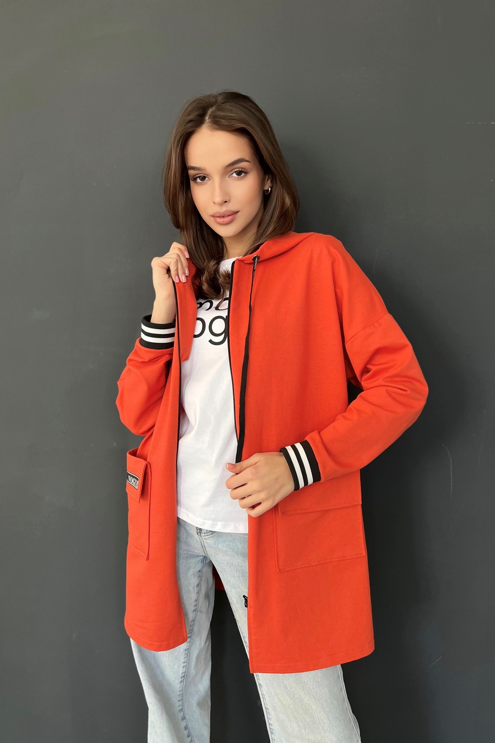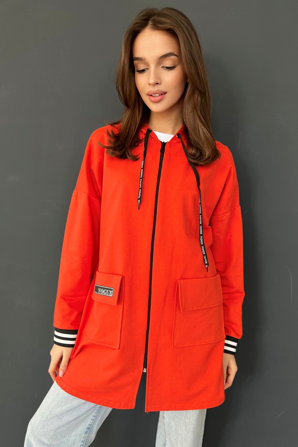 Толстовка прямая, свободная, удлиненная, с капюшоном, на молнии. Рукав длинный, на эластичном манжете. На полочке обработаны накладные карманы с клапаном.