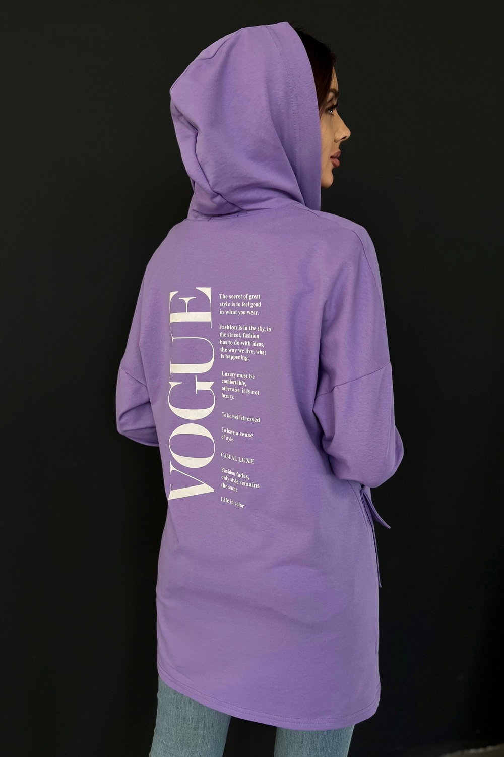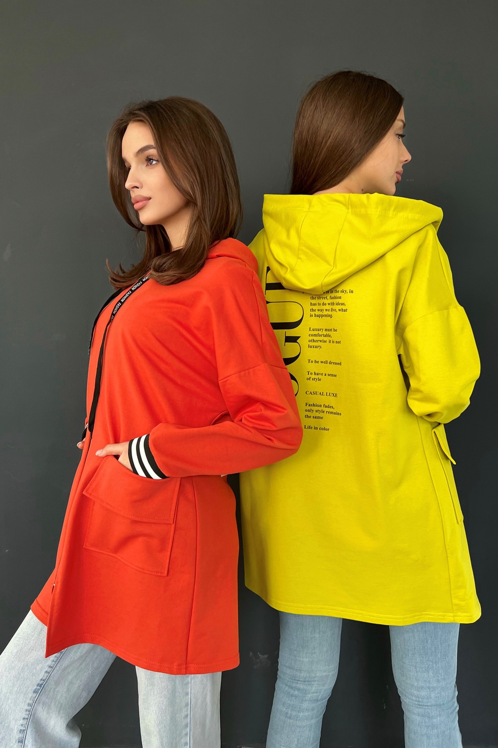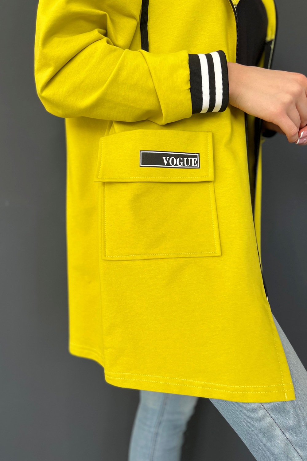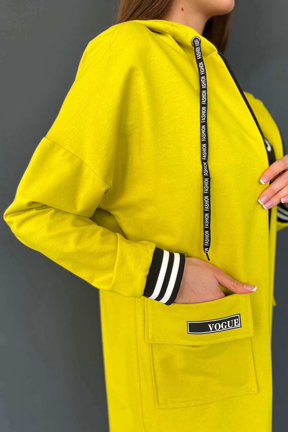 Толстовка прямая, свободная, удлиненная, с капюшоном, на молнии. Рукав длинный, на эластичном манжете. На полочке обработаны накладные карманы с клапаном.