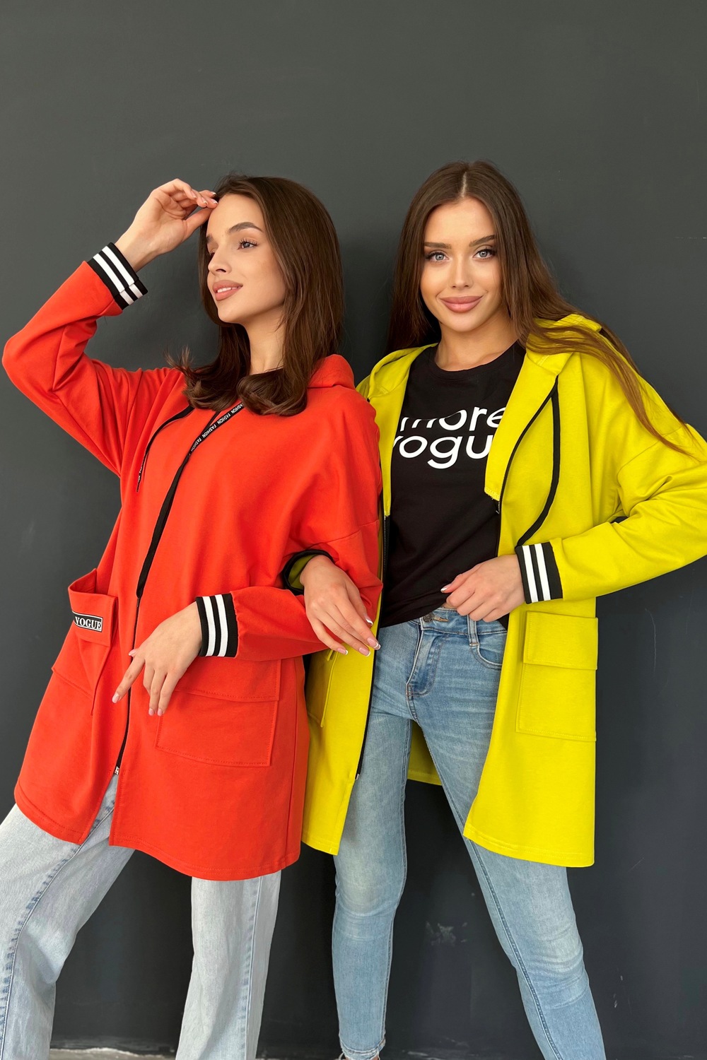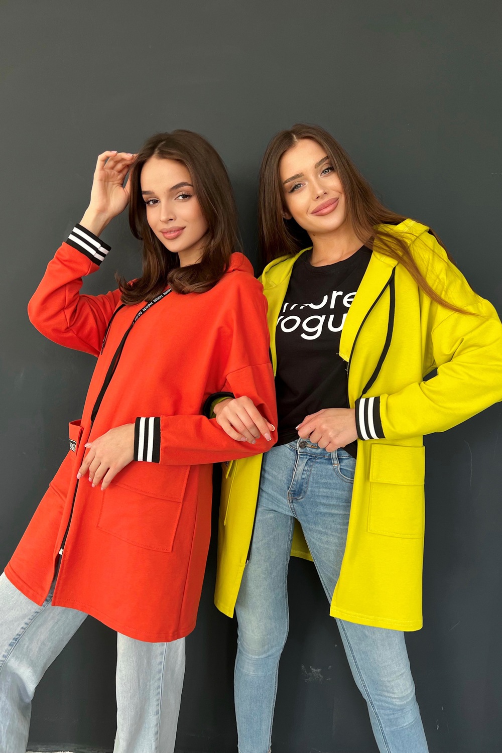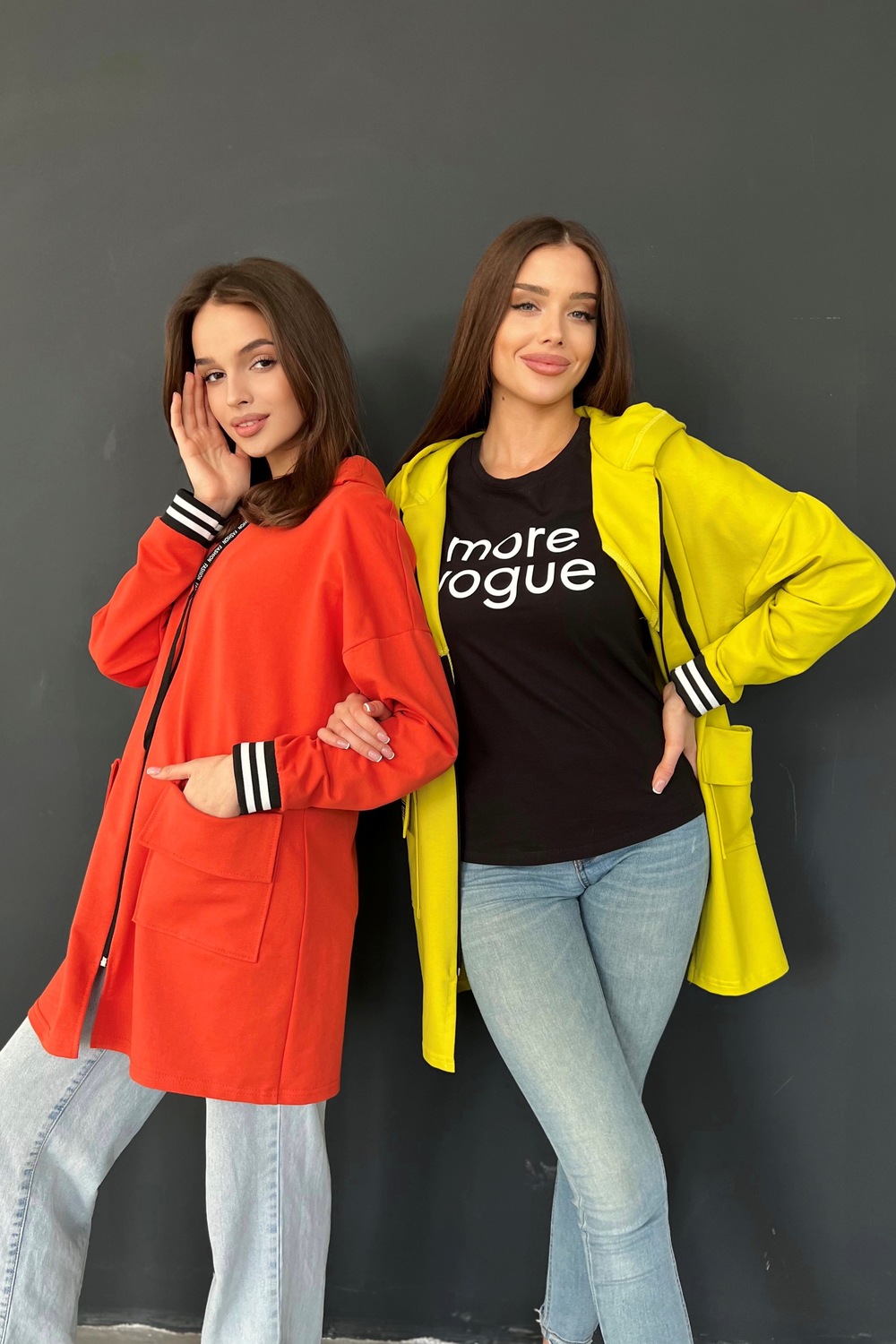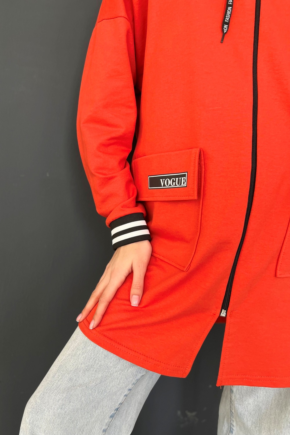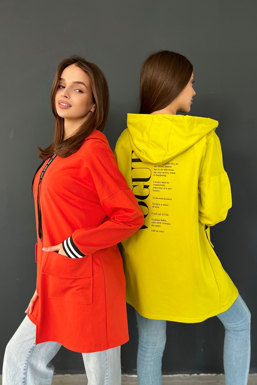 Толстовка прямая, свободная, удлиненная, с капюшоном, на молнии. Рукав длинный, на эластичном манжете. На полочке обработаны накладные карманы с клапаном.