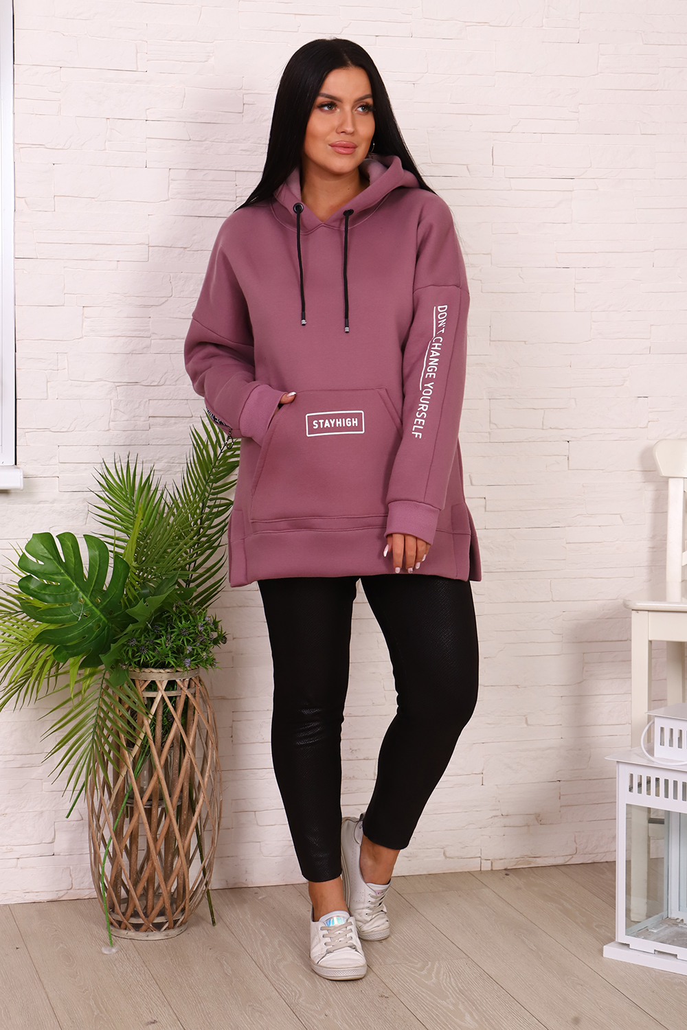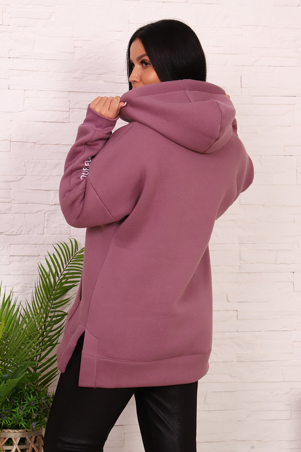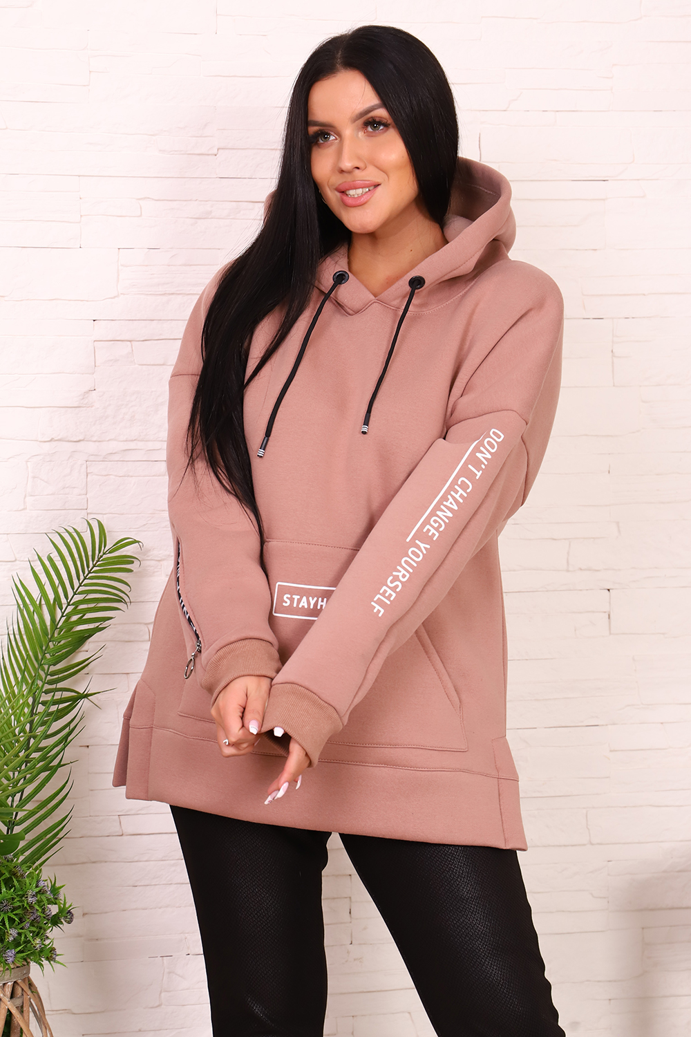 Толстовка женская со спущенным плечом, капюшоном, с декоративным шнурком. На полочке карман-кенгуру с печатью. На правом рукаве вшита декоративная молния, на левом - печать. По бокам толстовки небольшие разрезы. Низ толстовки оформлен широким поясом.