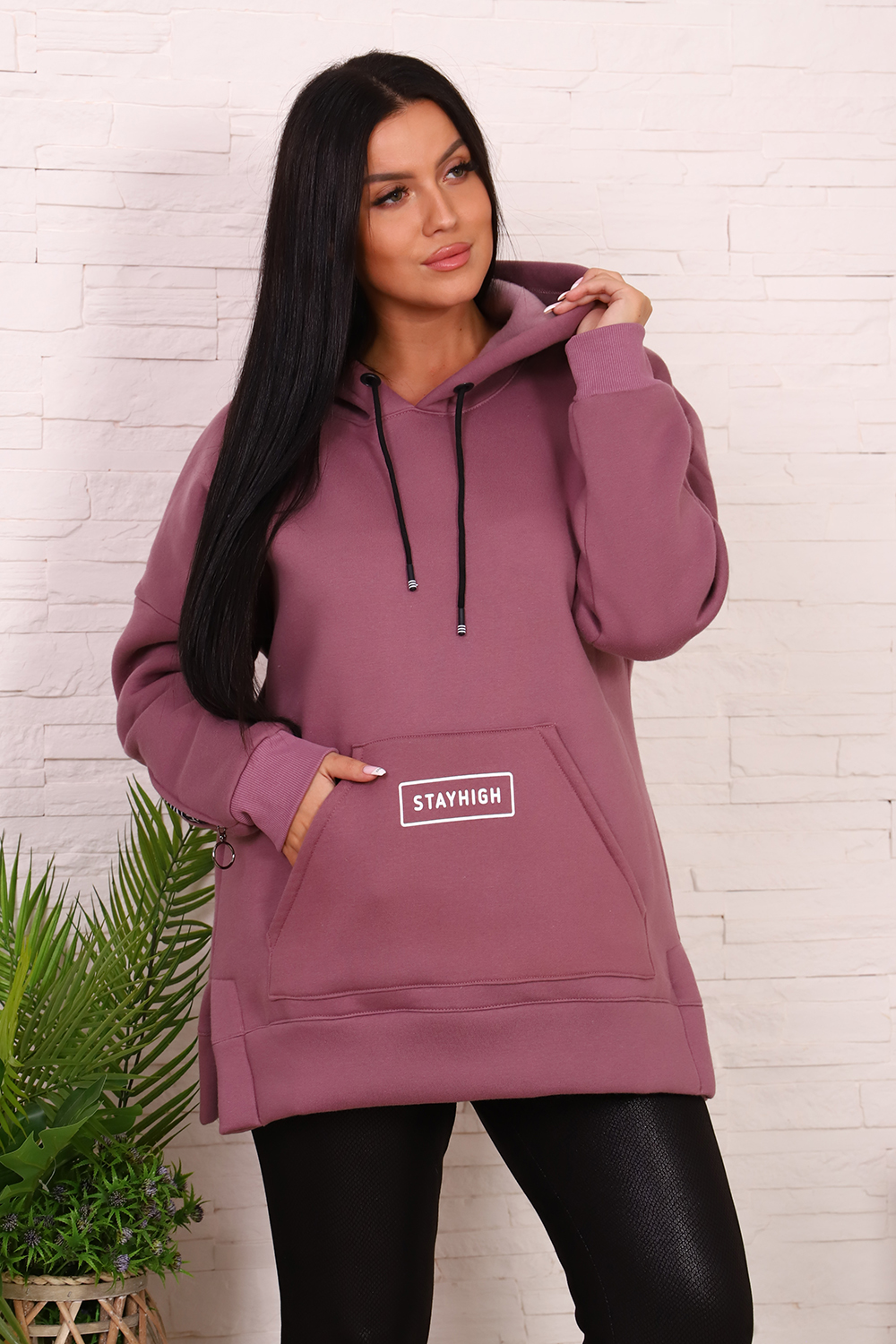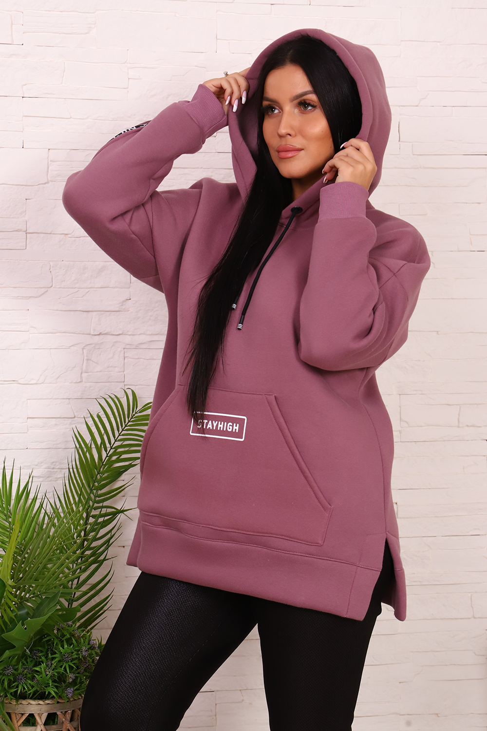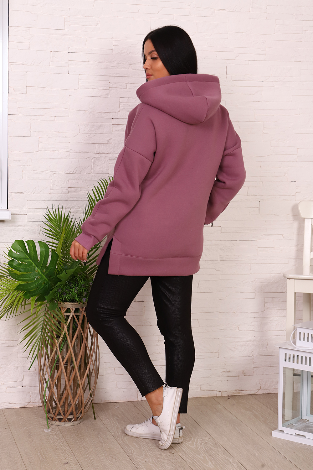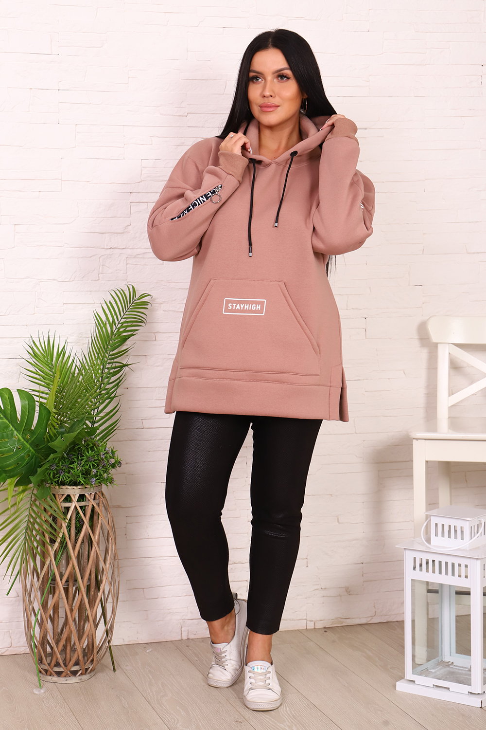 Толстовка женская со спущенным плечом, капюшоном, с декоративным шнурком. На полочке карман-кенгуру с печатью. На правом рукаве вшита декоративная молния, на левом - печать. По бокам толстовки небольшие разрезы. Низ толстовки оформлен широким поясом.