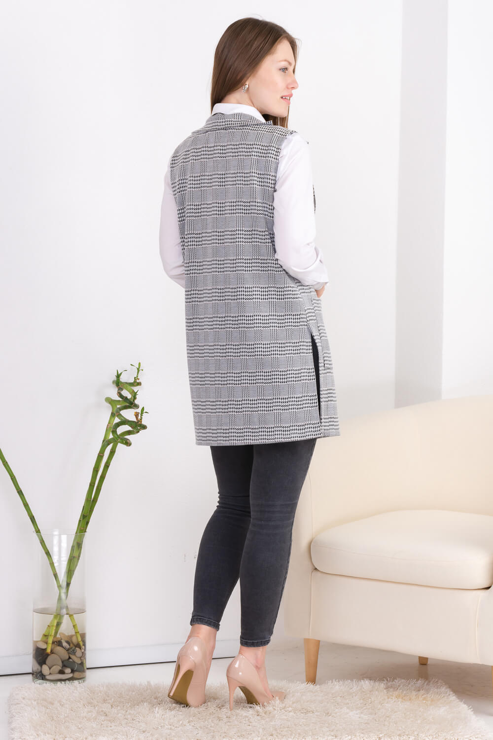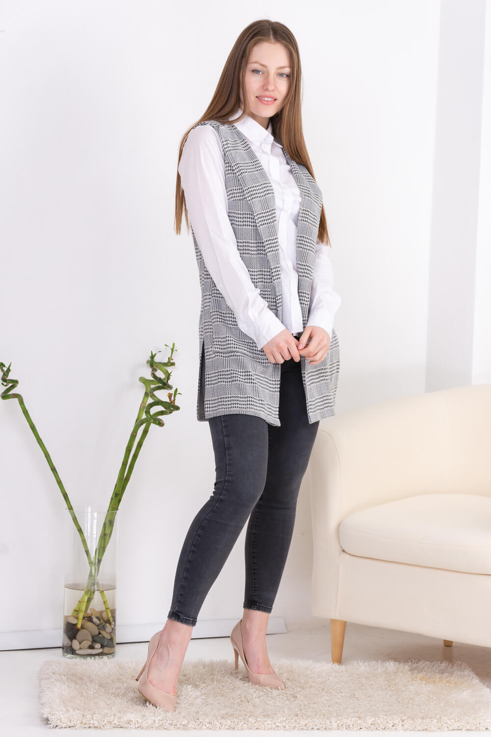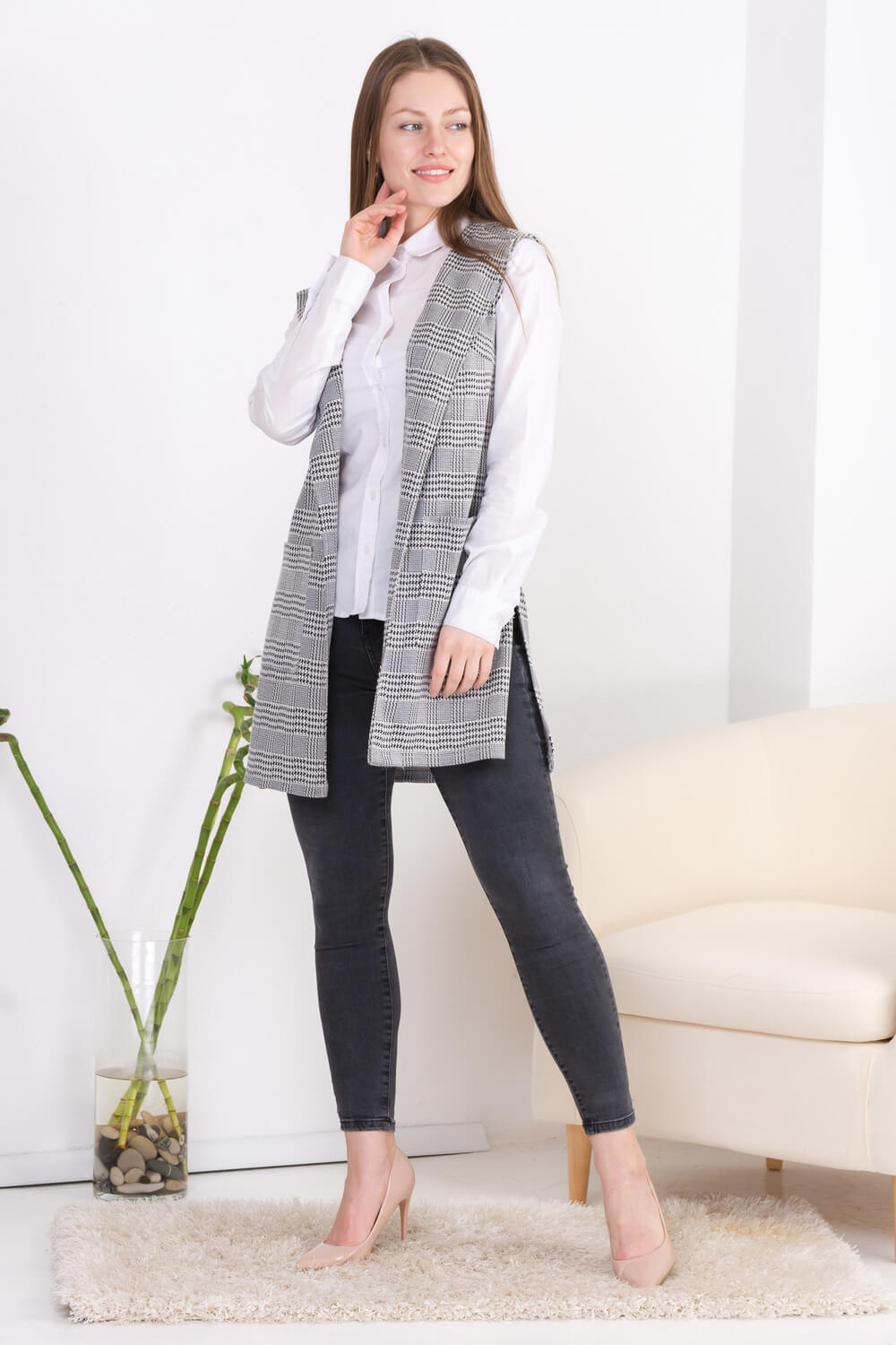 Модный жилет выполнен в сдержанных, классических тонах. Накладные карманы. По бокам шлицы. Комбинировать рекомендуется с рубашкой, зауженными брюками или прямой юбкой.