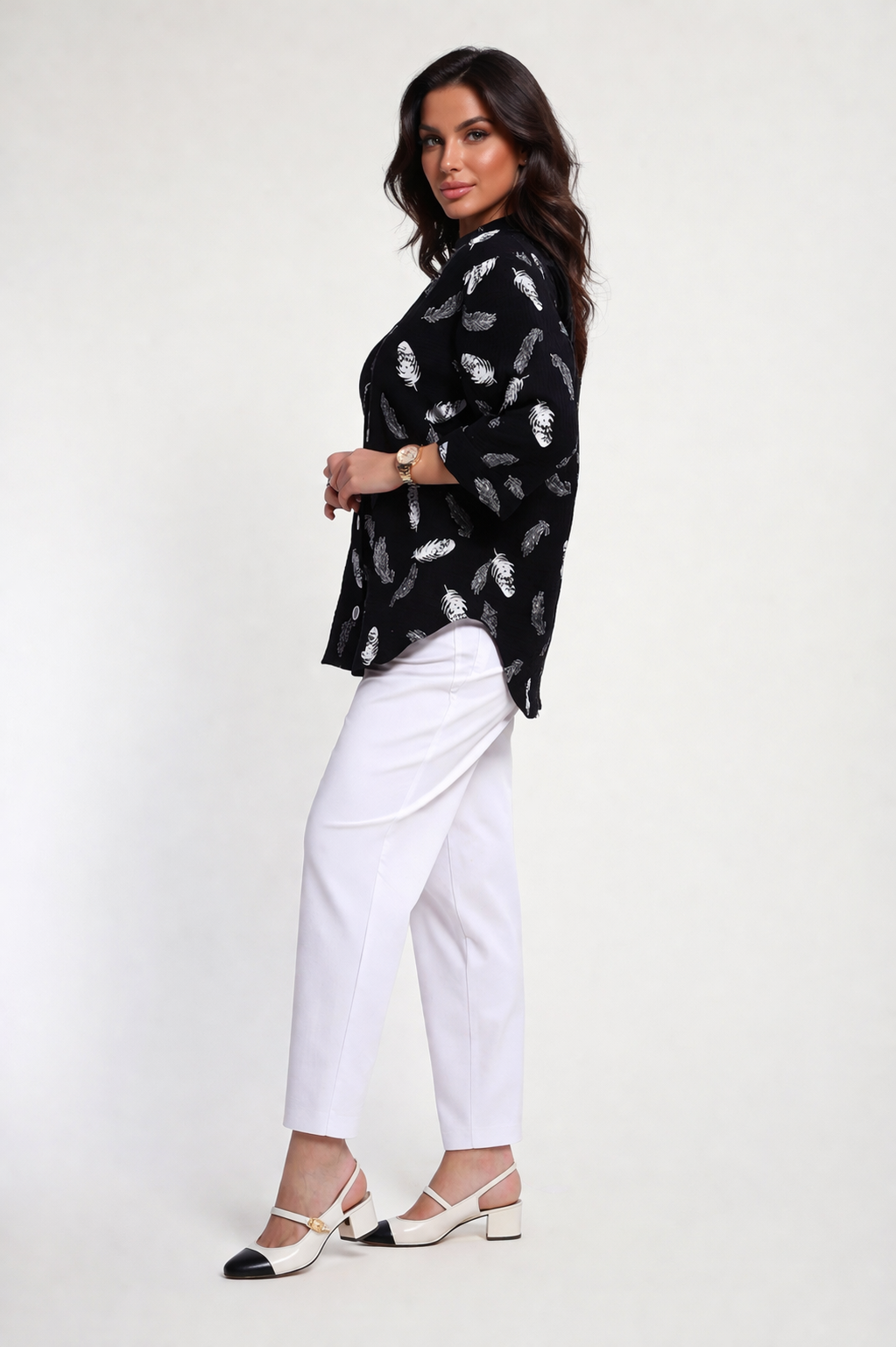 Модель выполнена в свободном крое с удлиненным силуэтом и аккуратно оформленным фигурным низом. Рукава длиной 3/4 дополнены манжетами, а воротник-стойка придает образу аккуратность и завершенность. Застежка на пуговицах формирует изящный V-образный вырез, визуально вытягивая шею и делая силуэт более утонченным.