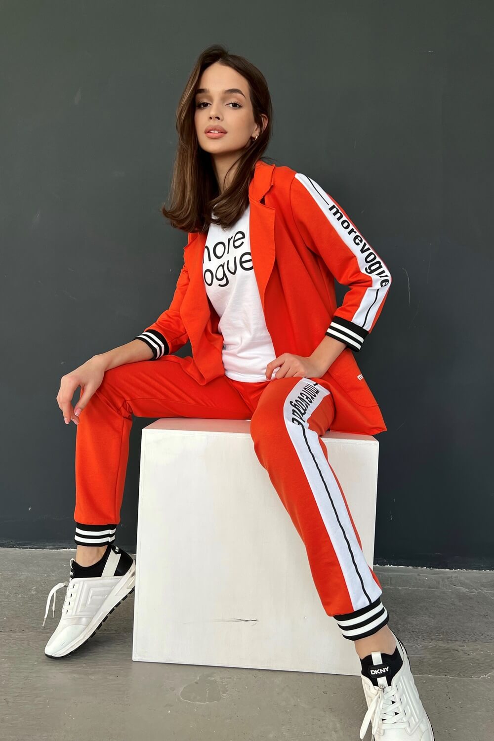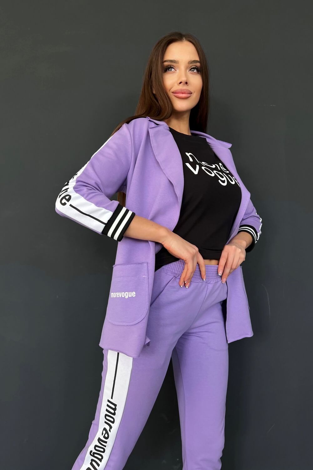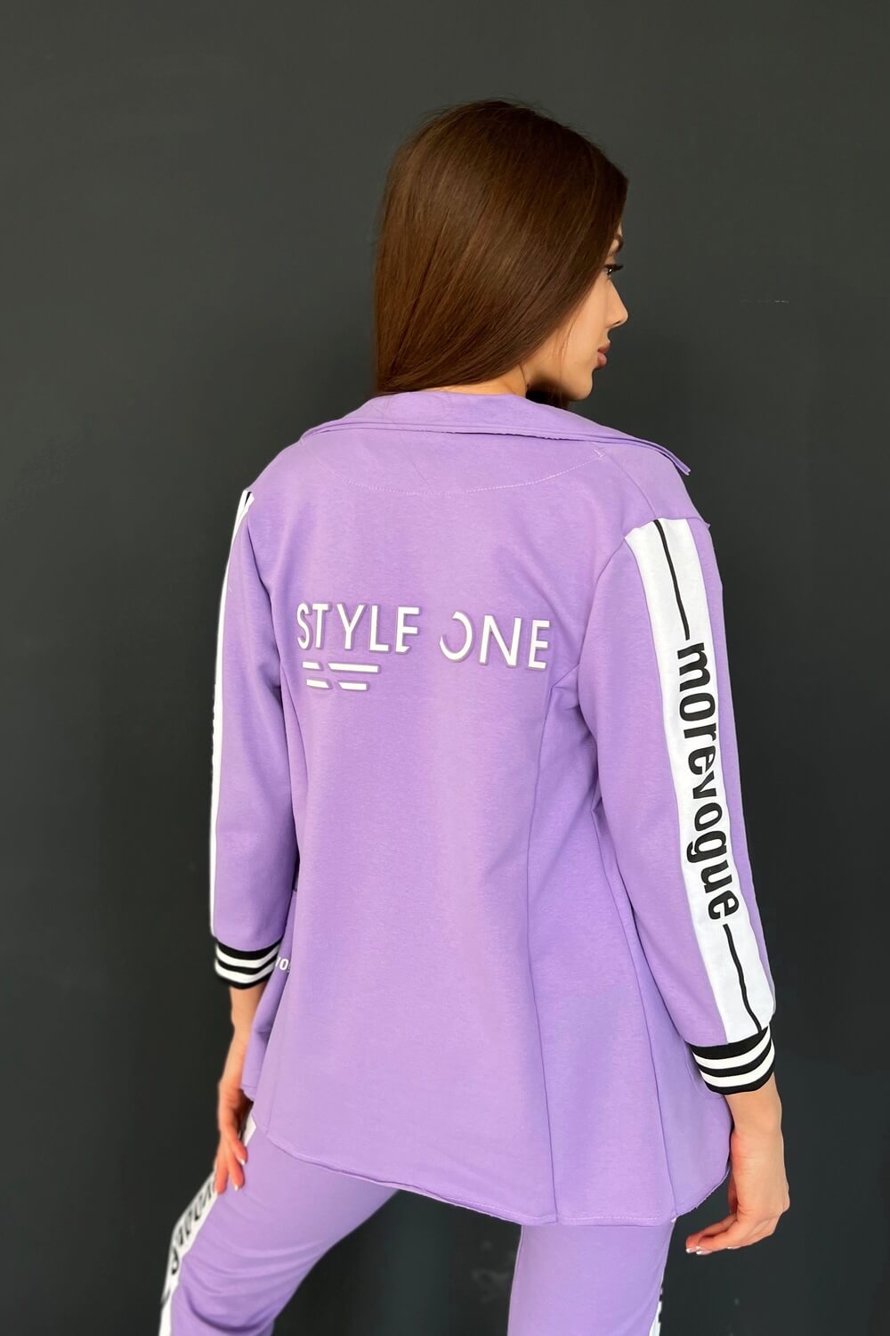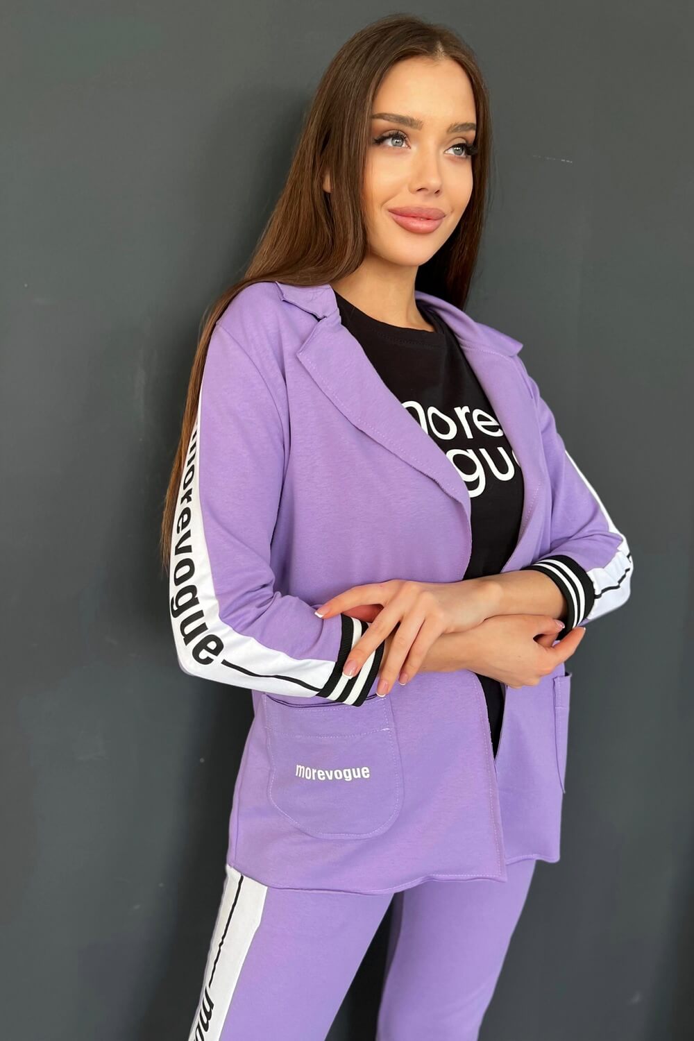 Жакет полуприлегающего силуэта, длиной до середины бедра, с английским воротником. Рукав втачной, длинной 7/8, с отделочным лампасом вдоль рукава, на эластичном манжете. В нижней части полочки расположены накладные карманы. Спинка с рельефами.