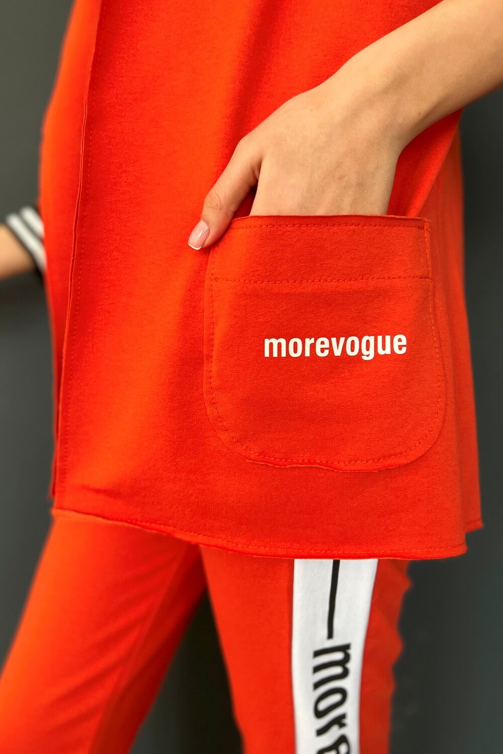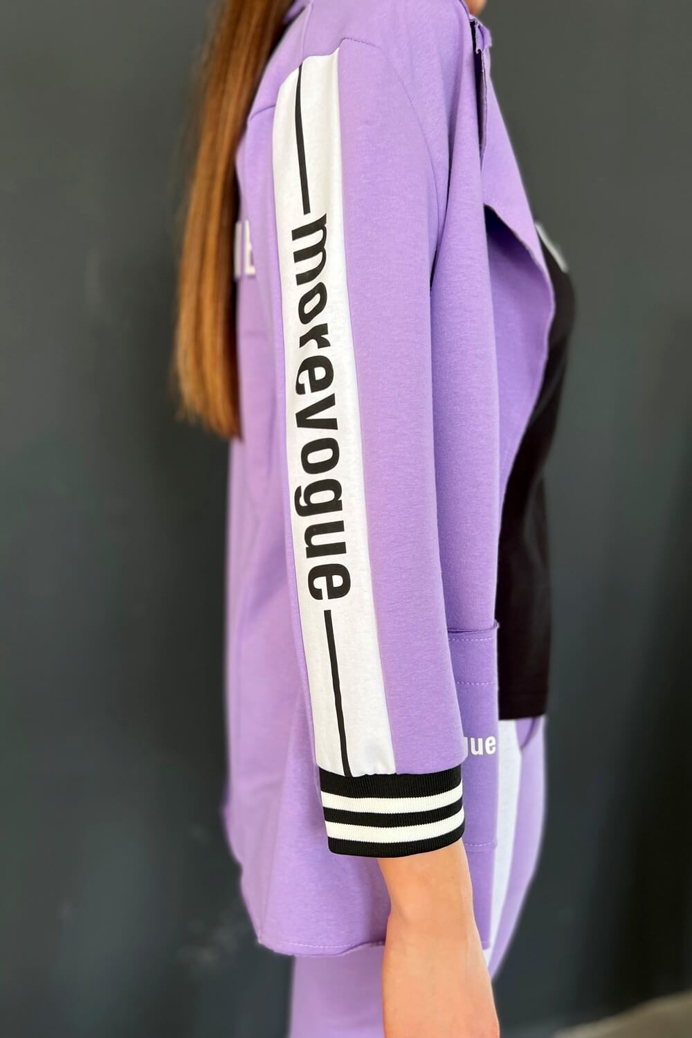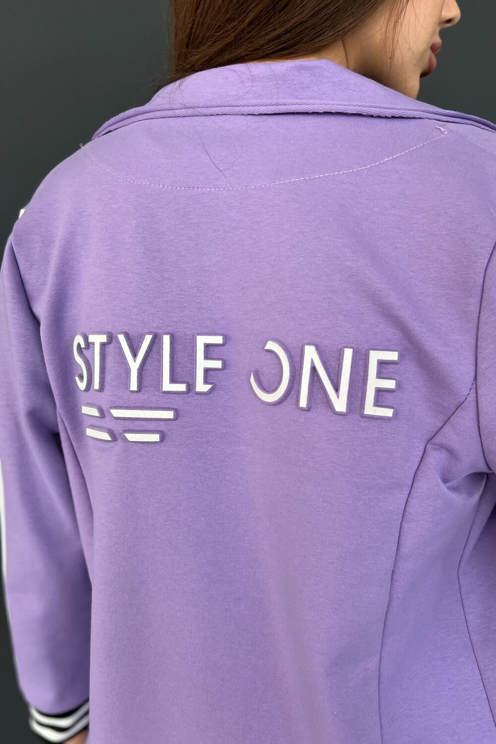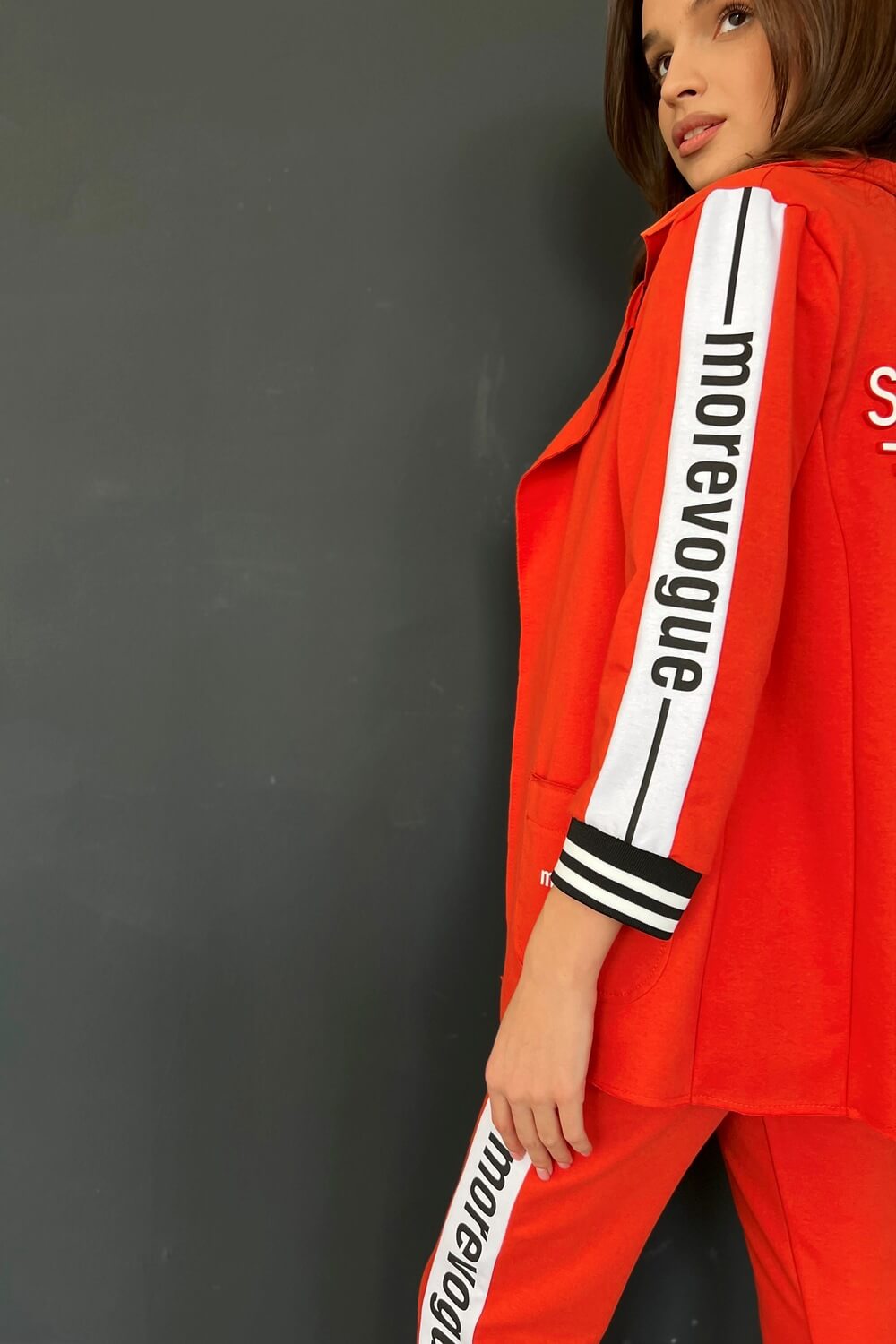 Жакет полуприлегающего силуэта, длиной до середины бедра, с английским воротником. Рукав втачной, длинной 7/8, с отделочным лампасом вдоль рукава, на эластичном манжете. В нижней части полочки расположены накладные карманы. Спинка с рельефами.
